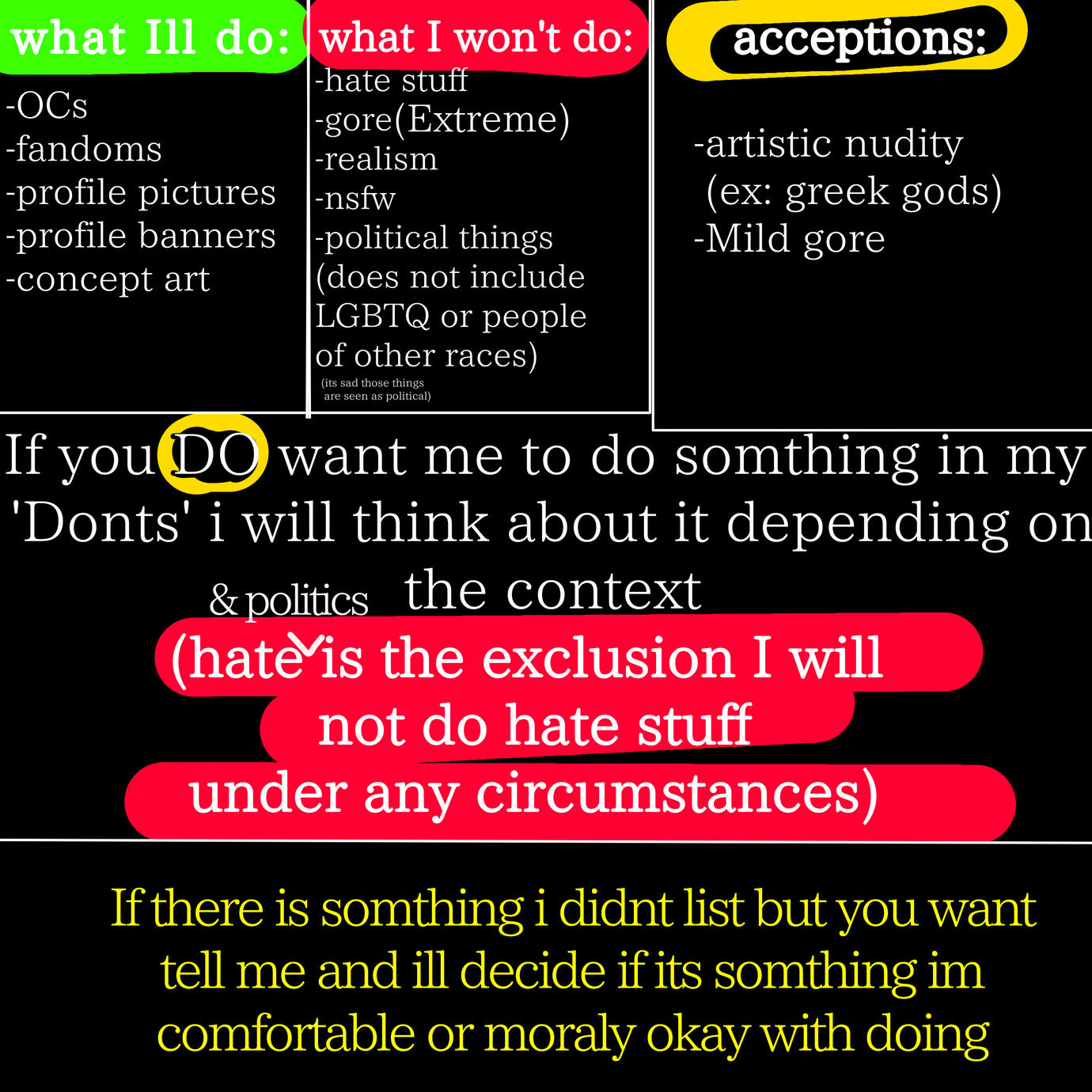 Hi its my belated portfolio for art requests(aka I do art for free!)Contact info at bottom of page